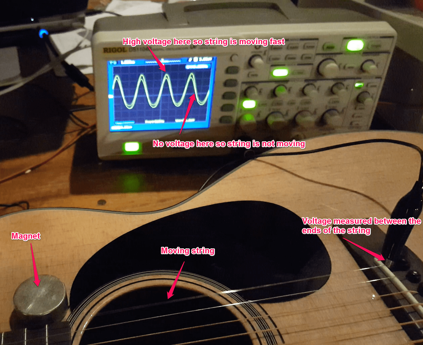 This is very similar to the way that some brushless motors work. You drive a current though them to make them move, then you listen for a voltage generated by the moving motor to figure out how fast it is turning. Our string really just is a very simple brushless motor except that it has zero turns (just one straight wire) and moves back and forth rather than round and round.